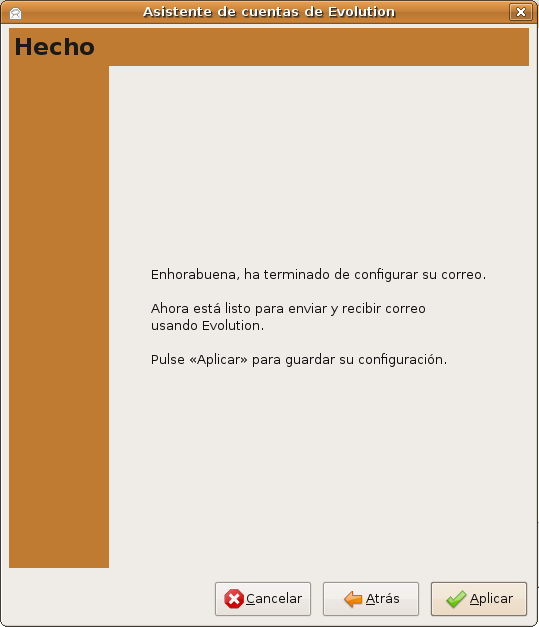 Ya tenemos nuestra cuenta de correo de Ubuntu Evolution configurada, pulsamos Aplicar y pasamos a la ventana inicial de cuentas de correo donde vemos la nueva creada.